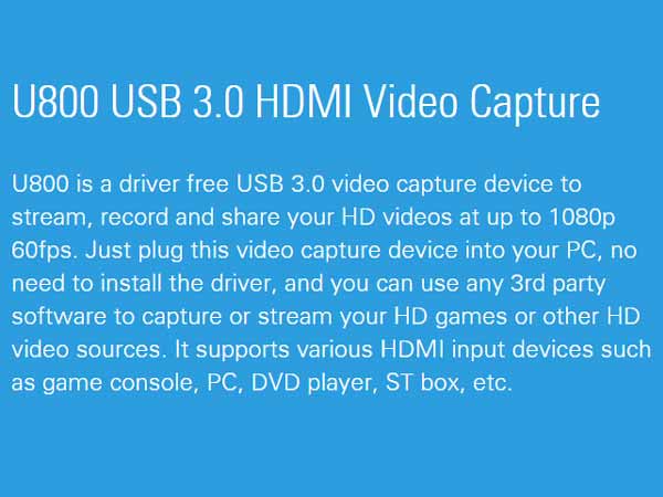 U800 is a driver-free USB 3.0 video capture device to stream, record and share your HD videos at up to 1080p 60fps. Just plug this video capture device into your PC, no need to install the driver, and you can use any 3rd party software to capture or stream your HD games or other HD video sources. It supports various HDMI input devices such as game consoles, PC, DVD players, ST boxes, etc.