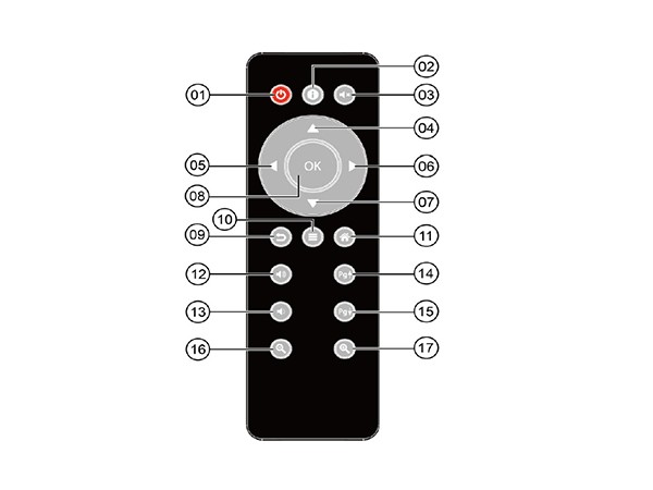 [01] Standby [02] Notification [03] Mute [04] UP [05] Left [06] Right [07] Down [08] OK [09] Return [10] Menu [11] home [12]VOL+ [13]VOL- [14]Page+ [15]Page- [16]Zoom out [17]Zoom in