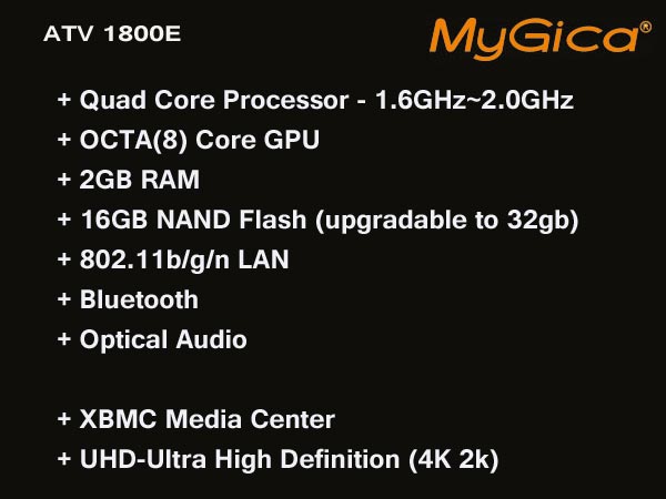 Mygica ATV1800 Quad Core&Octa (8)Core GPU Android Smart TV Box Only to connect the Quad Core Android TV box ATV1800 with your HDTV, and connect with power supply, your HDTV can directly become a smart Android PC with the Android Smart TV Box Quad Core ATV1800,you can surf the internet via WiFi, communicate with your friends via SNS applications, and enjoy online movies, music and photos with your families and friends. |